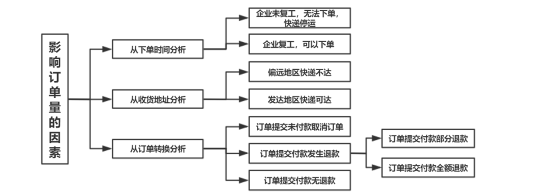 本文结合订单流程以逻辑树方法分析订单数目的影响因素,从以下几个维度展开: