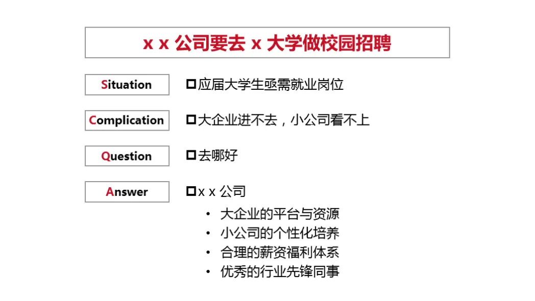 整个结构是通过描述当事者的现实状态,然后带出冲突和核心问题,通过结构化分析以提供更为明智的解决方案。以校园招聘SCQA分析为例: