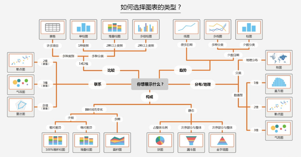 图表的选择,不只是关注图表的样式,而关键在于关注数据情况及图表展示的功能。可以通过数据展示的功能(构成、比较、趋势、分布及联系)进行图表选择,如下所示: