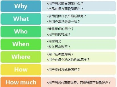 5W2H分析法又称七何分析法,包括:Why、What、Where、When、Who、How、How much 。主要用于用户行为分析、业务问题专题分析、营销活动等,是一个方便又实用的工具。