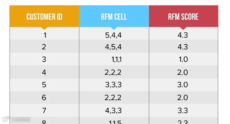 如果是解决异常值或者分布不均的问题,用分位数的方法就好了,我并没有太想明白市面上大行其道的打分法的意义在哪。我想到了一种可能,就是打分为了使三个维度可以在同一量纲上,进行衡量,以此可以计算一个用户的综合RFM得分,进行综合得分的排名。如下图: