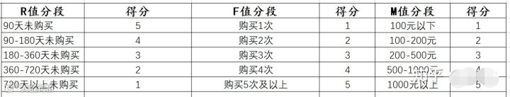 所谓的打分法,就是先将原始的R、F、M数值划分为1~5的分数,然后求分数均值,作为划分阈值。例如下图:
