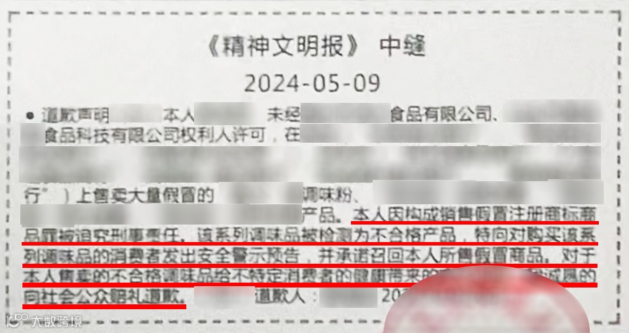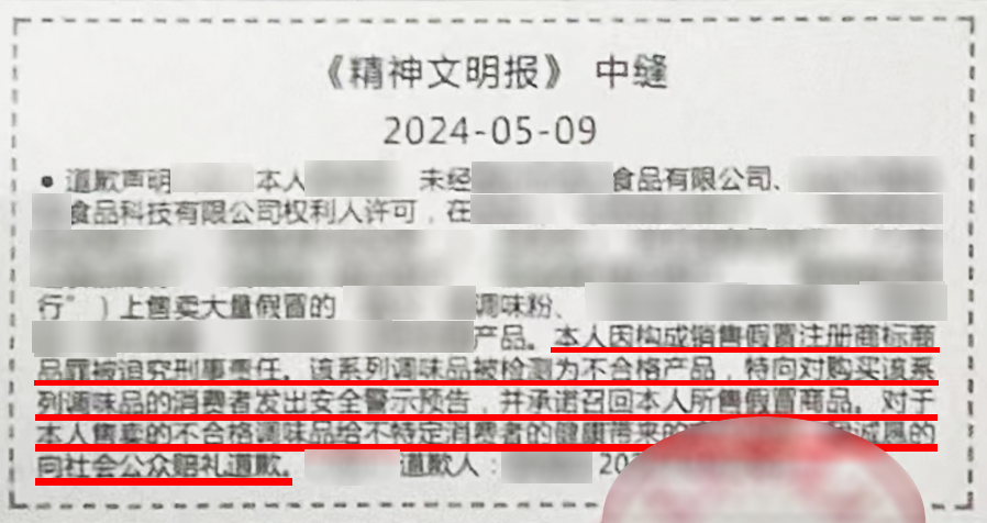 2024年5月9日《精神文明报》刊登这样一则公告:“本人因销售假冒注册商标的商品被追究刑事责任,该系列调味品被检测为不合格商品,现特对购买的消费者发出安全警示预告,并承诺召回本人所售假冒商品,对于本人售卖的不合格调味品给不特定消费者的健康带来的安全风险,我诚恳地向社会公众赔礼道歉……”