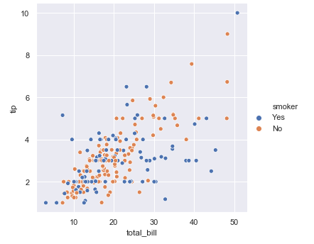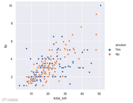 sns.relplot(x="total_bill", y="tip", hue="smoker", data=tips)# 利用hue 进行区分plt.show()
