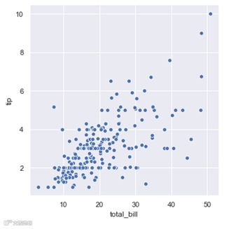 ## 绘制图形,根据不同种类的三点设定图注sns.relplot(x="total_bill", y="tip", data=tips);plt.show()