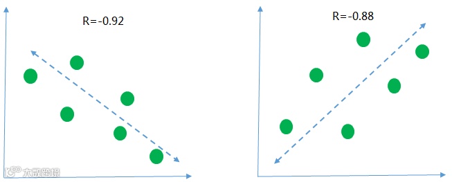 第一张图r=-0.92 <0 是说明横轴和纵轴的数据呈现负相关, 意思就是随着横轴的数据值越来越大纵轴的数据的值呈现下降的趋势, 从r的绝对值为0.92>0.8 来看, 说明两组数据的相关性高度相关