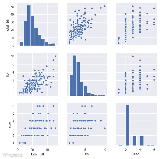 4. 任意看两个数据之间相关性可视化,比如看 total_bill 和 tip 之间的相关性,就可以如下操作进行可视化