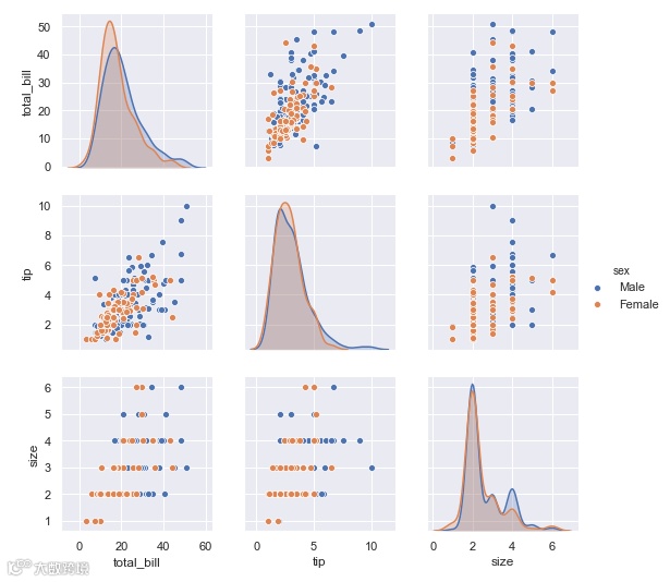 对于男性和女性群体, 在小费和总账单金额的关系上, 可以同样都是账单金额越高的时候, 小费越高的例子上, 男性要比女性给得小费更大方