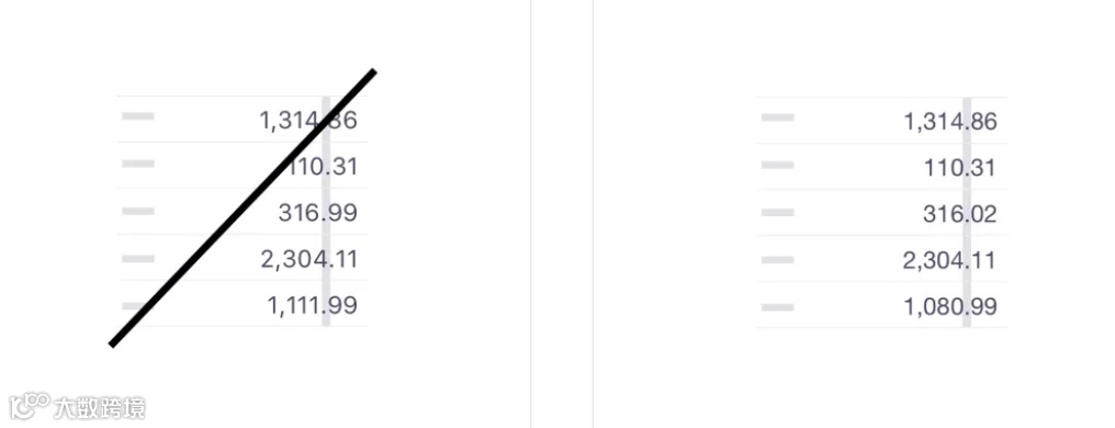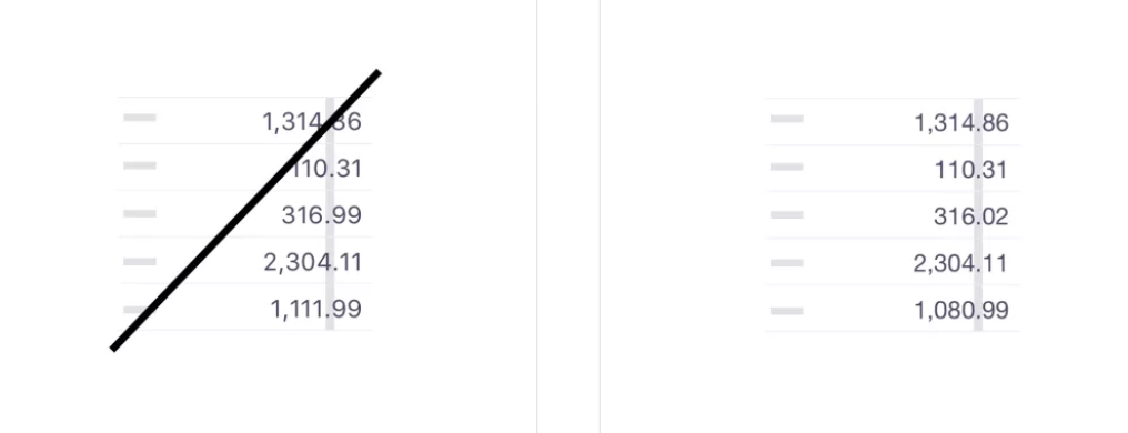 表格间距赋予所有的数字相同的宽度,使它们排列时能彼此对齐,使比较更容易。大多数流行字体都内置了表格。不确定字体是否正确?就看小数点(或任何数字)是否对齐就行。