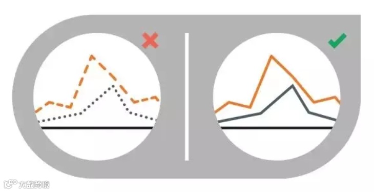 虚线,虚线容易分散注意力。相反,使用实线和颜色,反而容易区分彼此的区别。