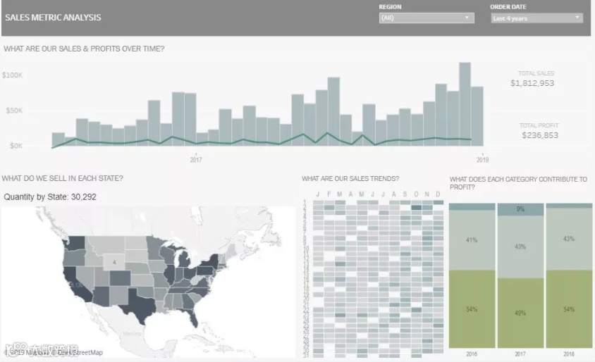 通过颜色的深浅来表达指标值的强弱和大小,是数据可视化设计的常用方法,用户一眼看上去便可整体的看出哪一部分指标的数据值更突出。