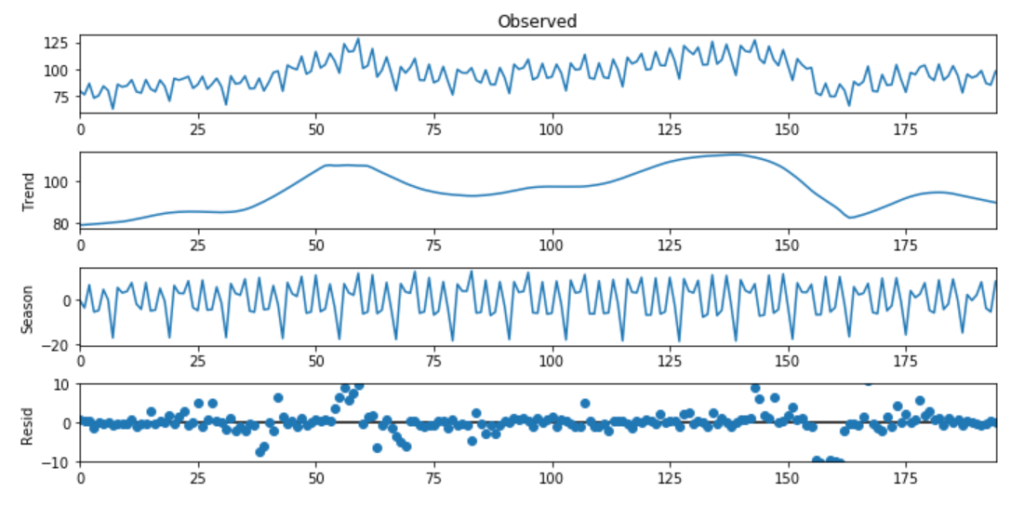 Import pandas as pdImport seaborn as snsImport matplotlib.pyplot as pltFrom statsmodels.tsa.seasonal import STLelecequip =read_csv(r"C:/Users/datas/python/data/elecequip.csv")stl = STL(elecequip, period=12, robust=True)res_robust = stl.fit()fig = res_robust.plot()
