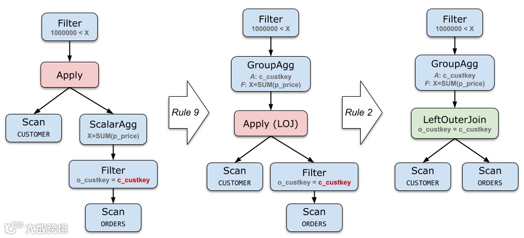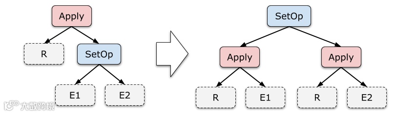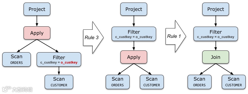 我们稍后就会看到这样做的巨大收益:当 Apply 被推最下面时,就可以应用第一组规则,直接把 Apply 变成 Join,也就完成了子查询去关联化的优化过程。
