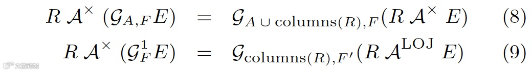 下面等式中,GA,FGA,F 表示带有 Group By 分组的聚合(Group Agg),其中 AA 表示分组的列,FF 表示聚合函数的列;G1FGF1 表示不带有分组的聚合(Scalar Agg)。