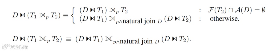 第一组规则是最基本的规则,等式中的 ⊗⊗ 说明它不限制连接类型,可以是 {×,LOJ,∃,∄}{×,LOJ,∃,∄} 中的任意一个。