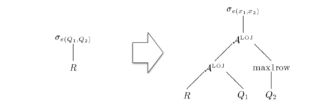 如果某个算子的表达式中出现了子查询,我们就把这个子查询提取到该算子下面(留下一个子查询的结果变量),构成一个 ALOJALOJ 算子。如果不止一个子查询,则会产生多个 ALOJALOJ。必要的时候加上 Max1RowMax1Row 算子。 -