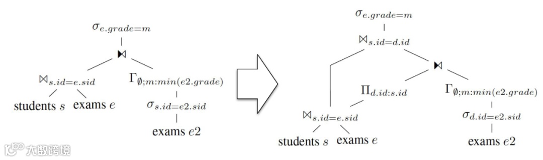 下面是对 Query 2 应用规则 (3) 的例子。之后再应用规则 (1),就完成了去关联化过程。
