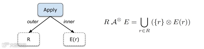 Apply 的含义用下图右半部分的集合表达式定义:对于 Outer Relation RR 中的每一条数据 rr,计算 Inner Relation E(r)E(r),输出它们连接(Join)起来的结果 r⊗E(r)r⊗E(r)。Apply 的结果是所有这些结果的并集(本文中说的并集指的是 Bag 语义下的并集,也就是 UNION ALL)。