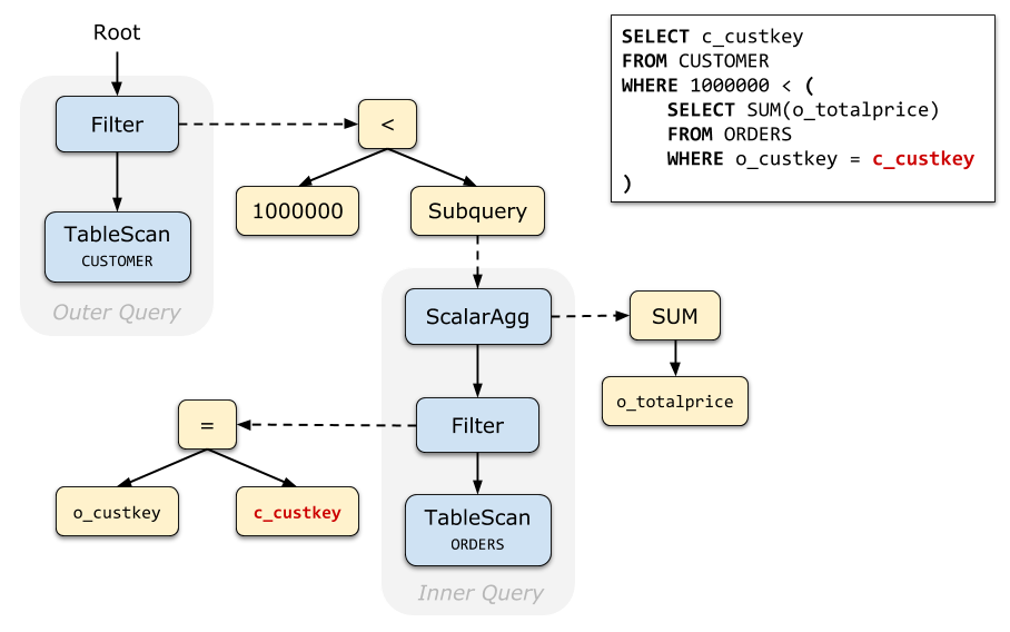 ▲ Query 1: 一个出现在 WHERE 子句中的标量子查询,关联参数用红色字体标明了