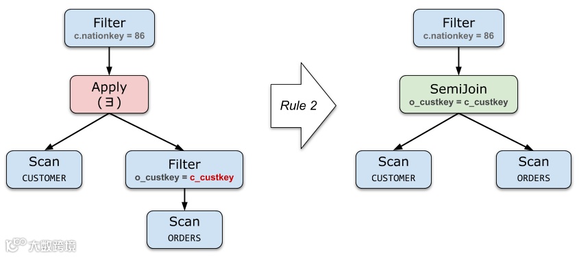 上文说到的 Relation - Expression - Relation 这种交替引用不仅执行性能堪忧,而且,对于优化器也是个麻烦的存在——我们的优化规则都是在匹配并且对 Relation 进行变换,而这里的子查询却藏在 Expression 里,令人无从下手。