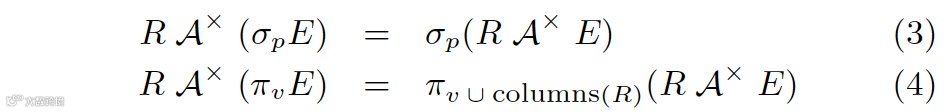 下面的等式中,×× 表示 Cross Join,⋈R.key⋈R.key 表示按照 RR 的 Key 做自然连接:r∘e1∘e2r∘e1∘e2 。和之前一样,我们假设 RR 存在主键或唯一键,如果没有也可以在 Scan 的时候加上一个。