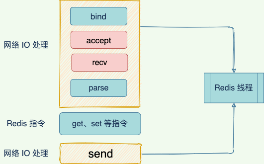 其中,bind/listen、accept、recv、parse 和 send 属于网络 IO 处理,而 get 属于键值数据操作。既然 Redis 是单线程,那么,最基本的一种实现是在一个线程中依次执行上面说的这些操作。