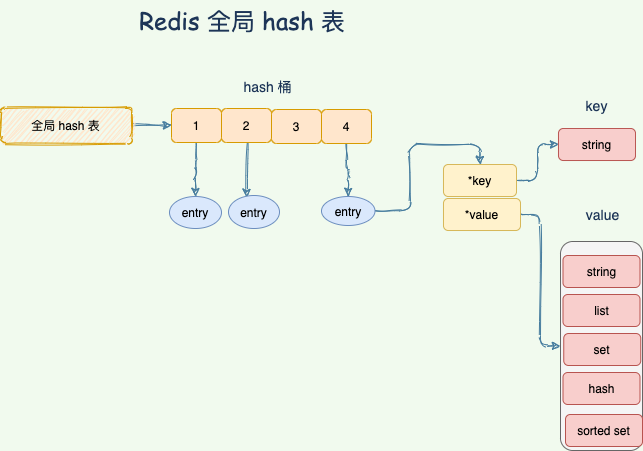 Redis 整体就是一个 哈希表来保存所有的键值对,无论数据类型是 5 种的任意一种。哈希表,本质就是一个数组,每个元素被叫做哈希桶,不管什么数据类型,每个桶里面的 entry 保存着实际具体值的指针。
