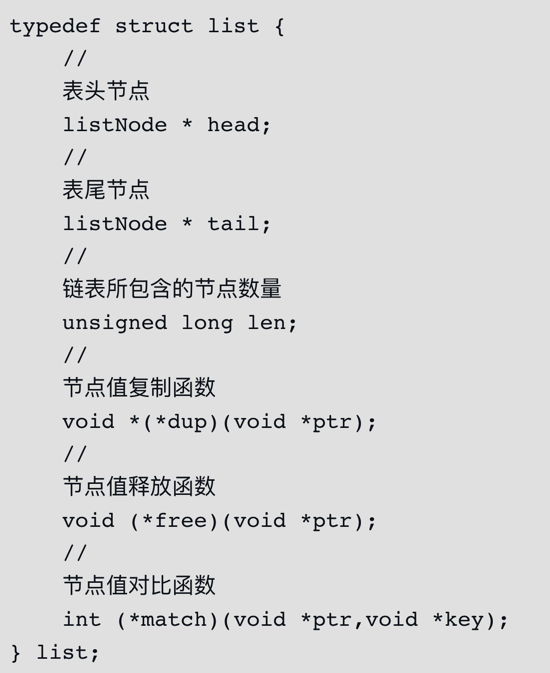 多态:链表节点使用 void* 指针来保存节点值,并且可以通过 list 结构的 dup、free、match 三个属性为节点值设置类型特定函数,所以链表可以用于保存各种不同类型的值。