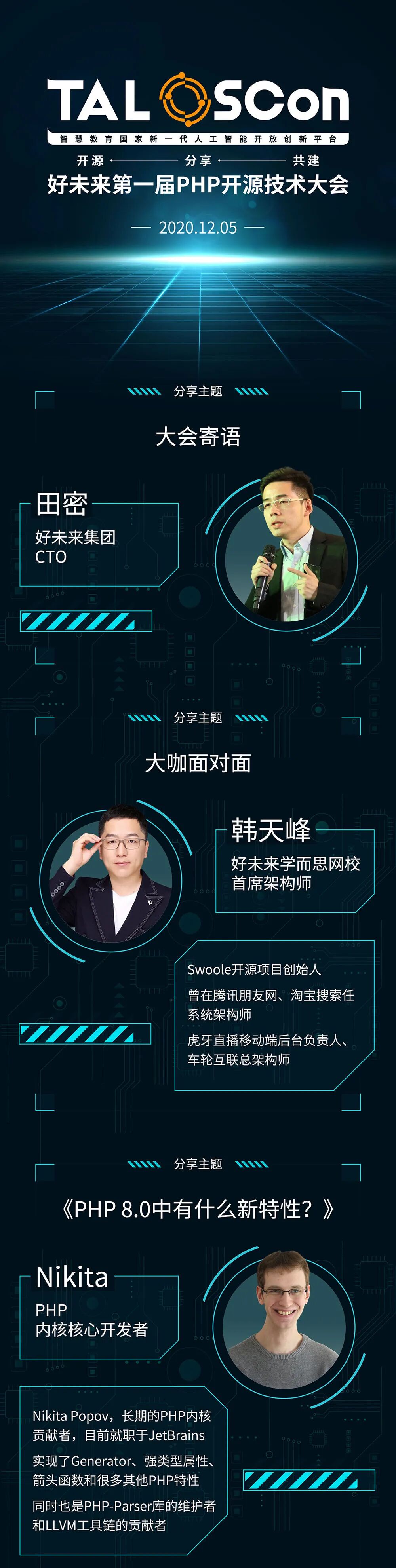基于以上原因,好未来第一届PHP开源技术大会应运而生,让我们的PHPer从前台到后台整个技术栈未来哪些新的东西,值得我们去学习。
