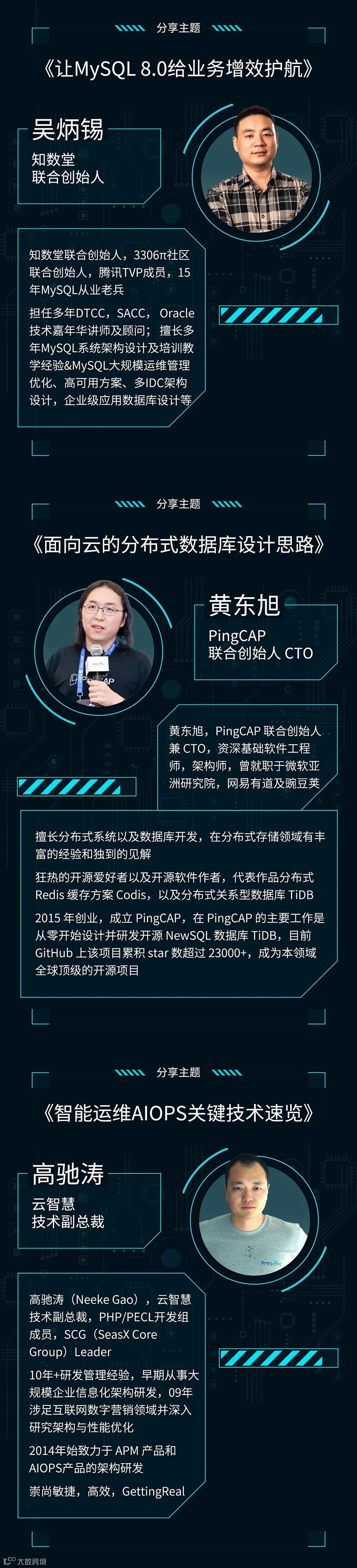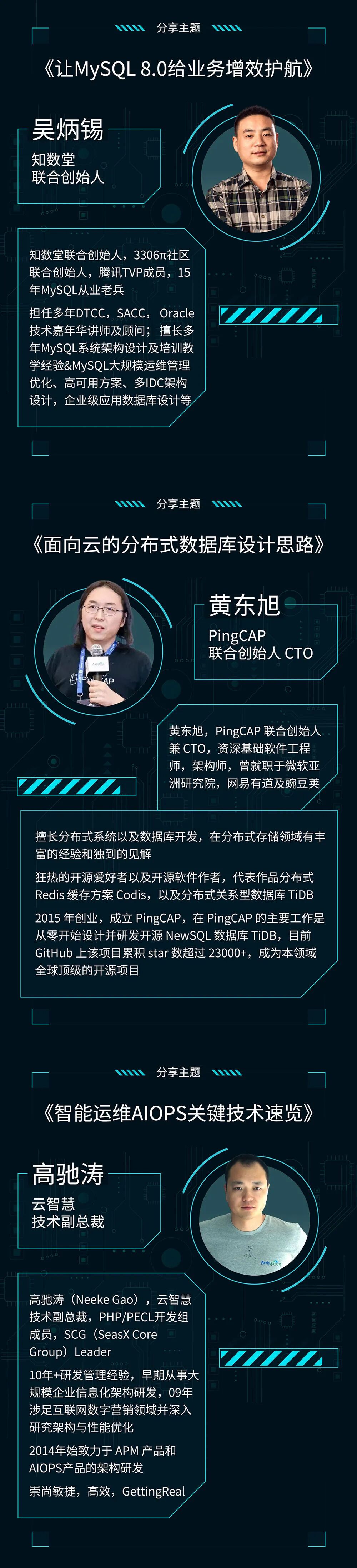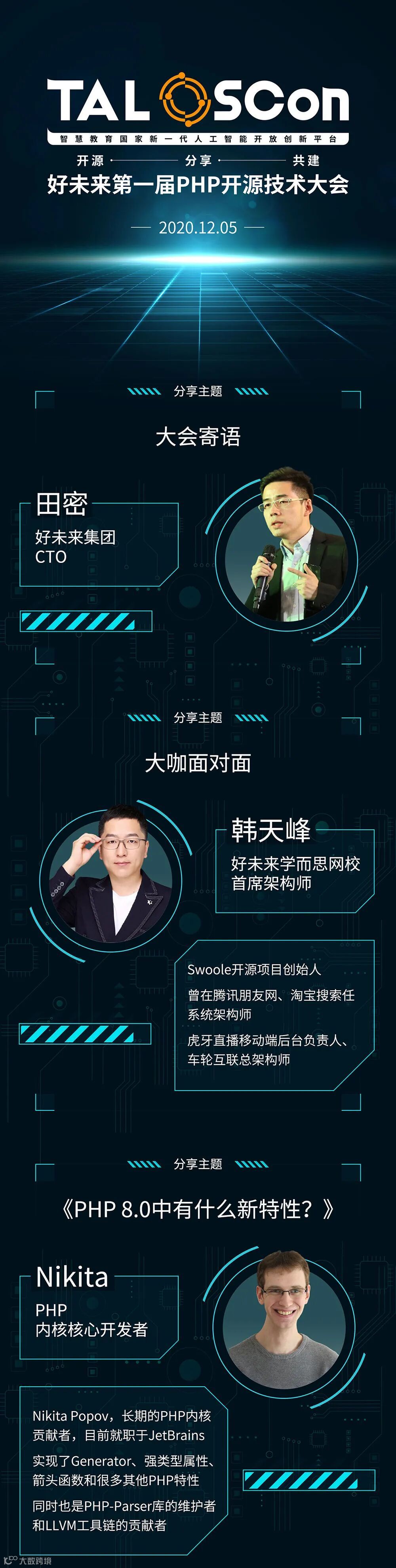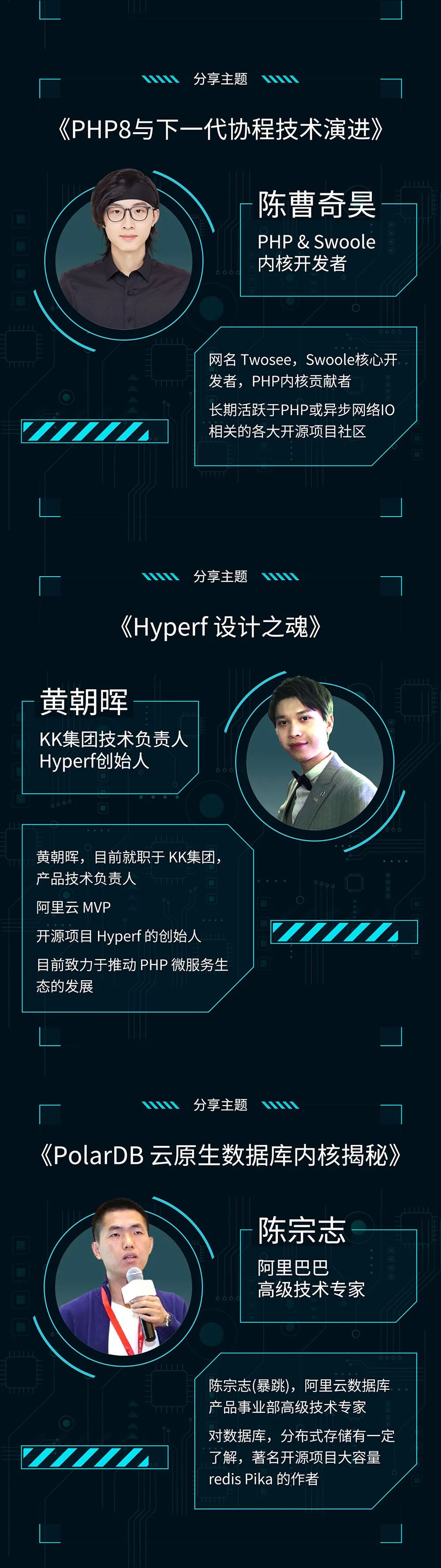 这次大会邀请了很多PHP和数据库领域的重磅大咖。被无数爱好者开发出诸如Yahoo、Facebook、新浪微博、贴吧等应用于PC端和手机端的优秀产品和App的后端语言PHP,仍在不断地超越着自己。在12月5日的大会上,Swoole创始人韩天峰、阿里云MVP陈宗志,与来自德国的PHP内核核心开发者Nikita将详细讲解包括PHP8.0中有什么新特性、PolarDB云原生数据库内核揭秘、Swoole开源项目未来的迭代方向等行业重磅议题。