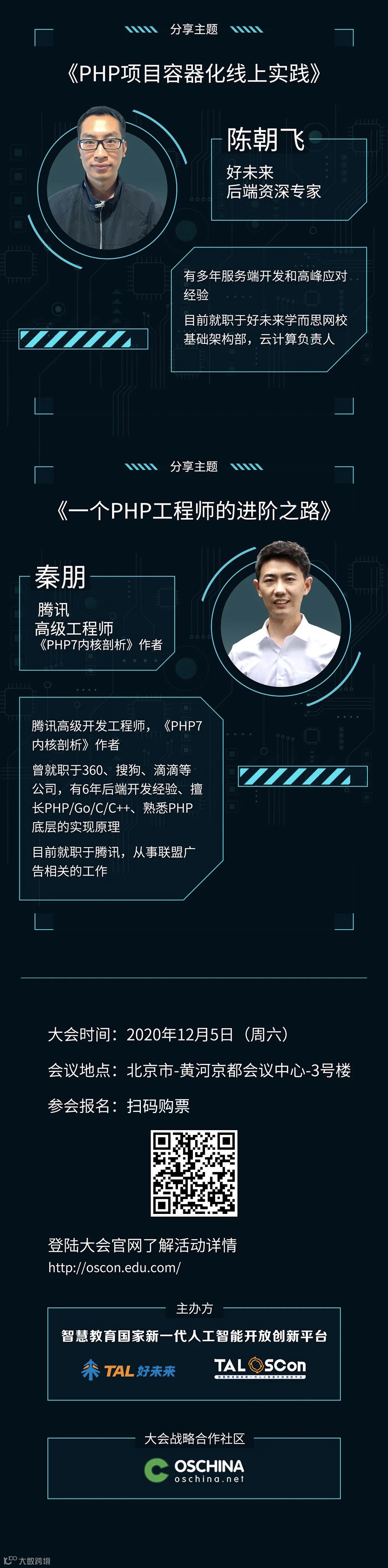 “听君一席话,胜读十年书。”12月5日,智慧教育国家新一代人工智能开放创新平台联合教育科技公司好未来、开源中国技术社区,特邀PHP领域顶尖大咖,将为全国PHP开发者和技术爱好者打造一场开源届的饕餮盛宴。
