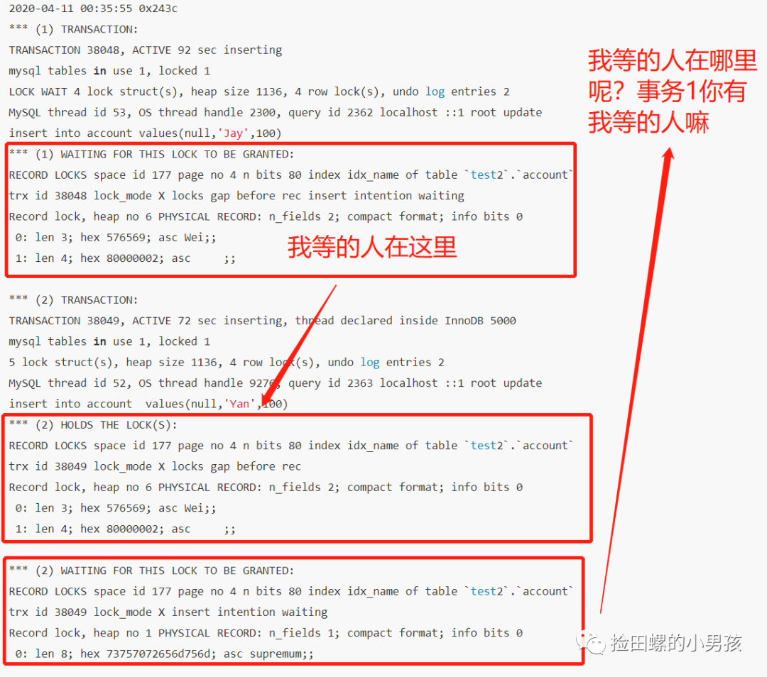 分析死锁日志(持有什么锁,等待什么锁)
