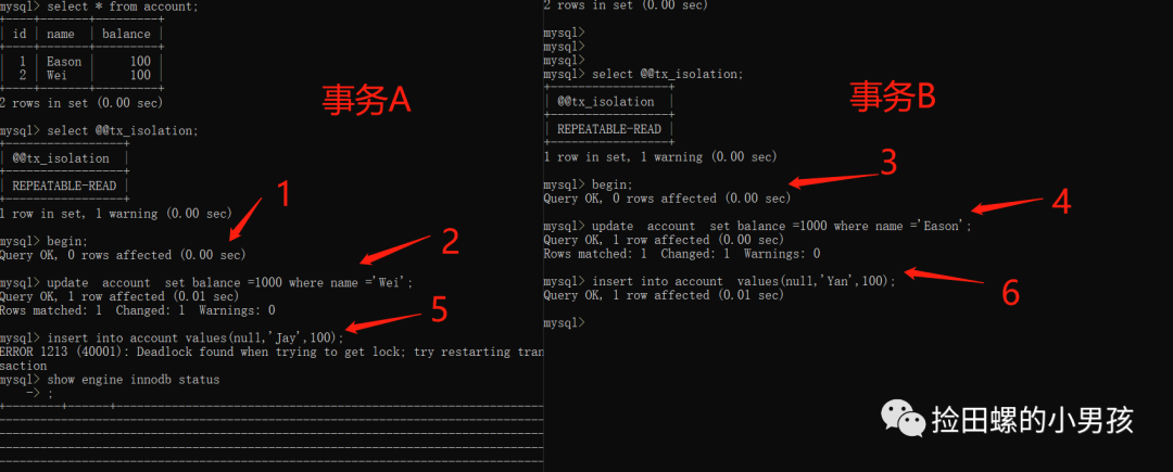 开启两个终端模拟事务并发情况,执行顺序以及实验现象如下: