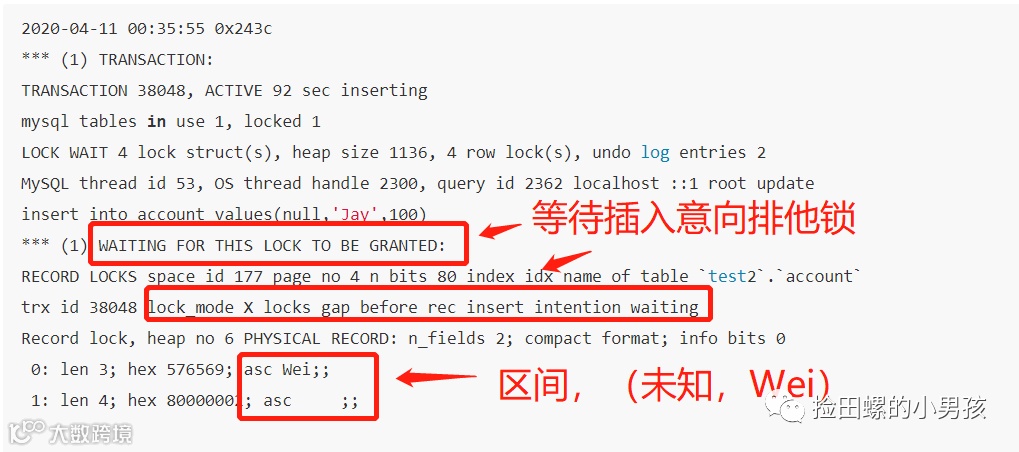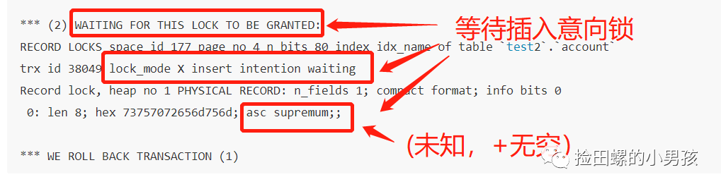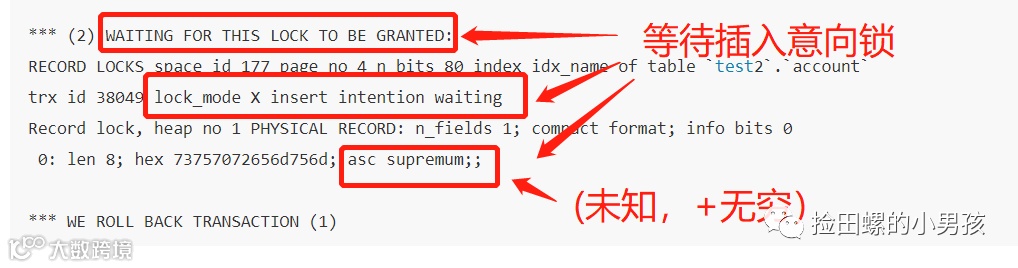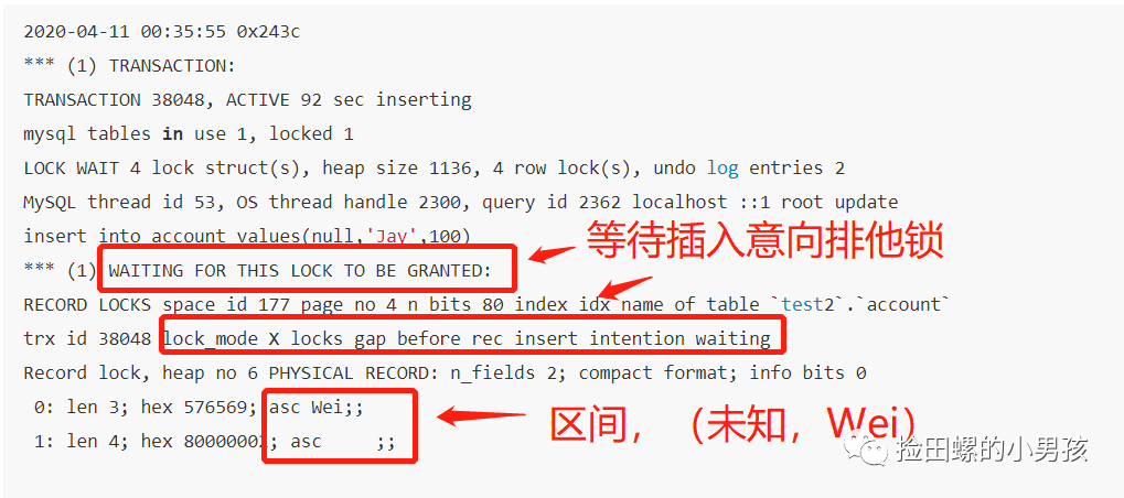 3)正在等待锁释放(WAITING FOR THIS LOCK TO BE GRANTED),插入意向排他锁(lockmode X locks gap before rec insert intention waiting),普通索引(idxname),物理记录(PHYSICAL RECORD),间隙区间(未知,Wei);