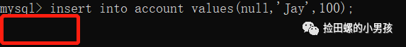 mysql> insert into account values(null,'Jay',100);