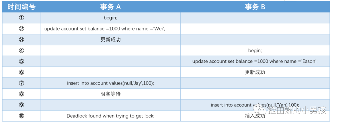 事务A持有(W,+∞)的Gap Lock,在等待(E,W)的插入意向锁,事务B持有(E,W)的Gap锁,在等待(W,+∞) 的插入意向锁,所以形成了死锁的闭环~(Gap锁与插入意向锁会冲突的,可以看回锁介绍的锁模式兼容矩阵哈~)