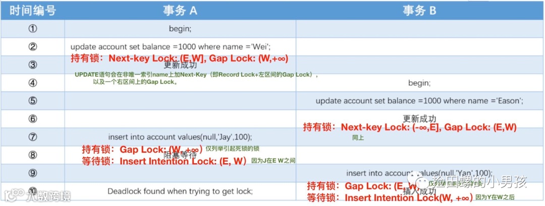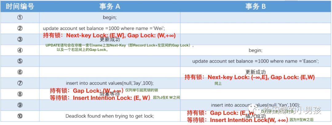 因此,事务A的update语句和insert语句执行完,它是持有了 (E,W]的 Next-Key锁,(W,+∞)的Gap锁,想拿到 (E,W)的插入意向排它锁,等待的锁跟死锁日志是对上的,哈哈~