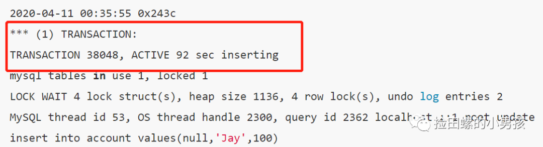 可以用 show engine innodb status,查看最近一次死锁日志哈~,执行后,死锁日志如下: