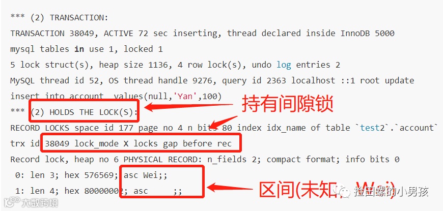 3)持有锁(HOLDS THE LOCK),间隙锁(lockmode X locks gap before rec),普通索引(index idxname),物理记录(physical record),区间(未知,Wei);