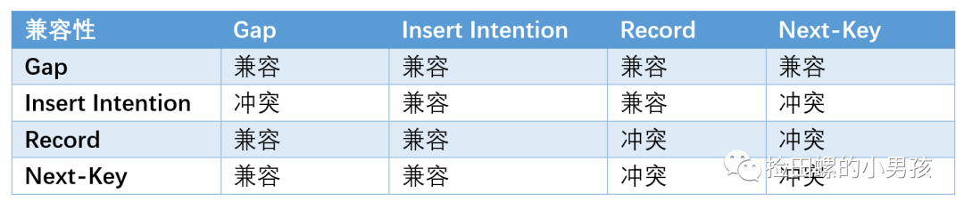 InnoDB存储引擎中锁的兼容性如下表: