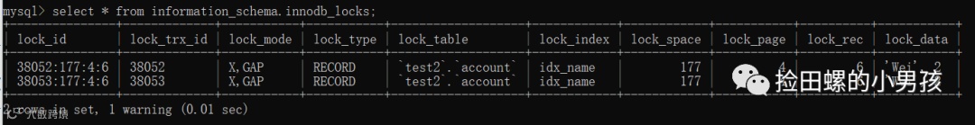 这时候可以用 select*frominformation_schema.innodb_locks;查看锁情况: