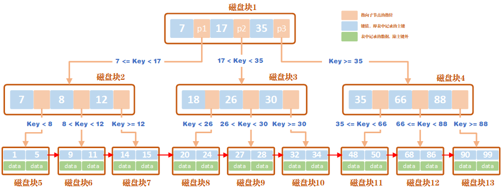 非叶子节点只存储键值信息,不再存储数据。 所有叶子节点之间都有一个链指针,指向下一个叶子节点。 数据都存放在叶子节点中。
