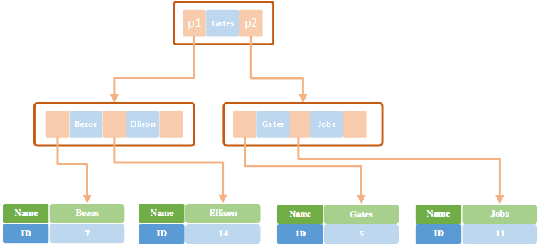 上图实际上是一种带有顺序索引的 B+Tree,与最基本的 B+Tree 的区别就在于叶子节点是否通过指针相连。一般数据库中常用的结构都是这种带有顺序索引的 B+Tree。后文探讨的也都是带顺序索引的 B+Tree 结构。
