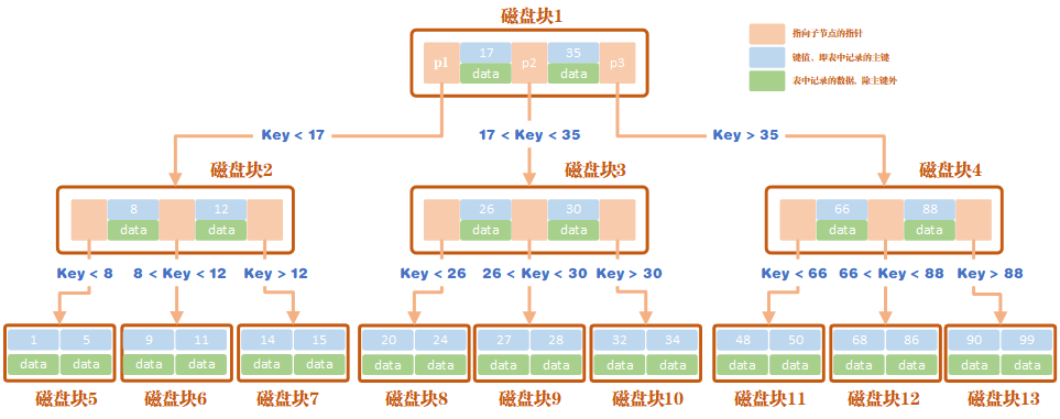 非叶子结点的key都是 [key, data] 二元组,其中 key 表示作为索引的键,data 为键值所在行的数据;