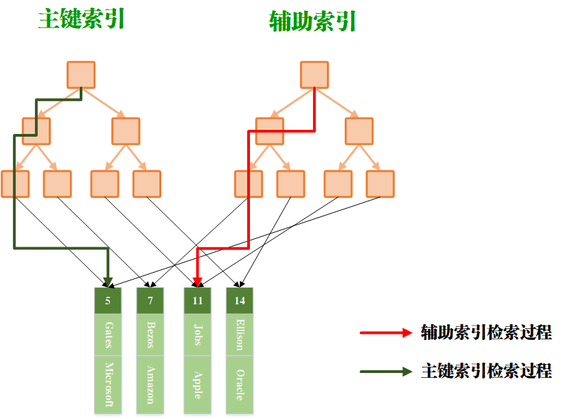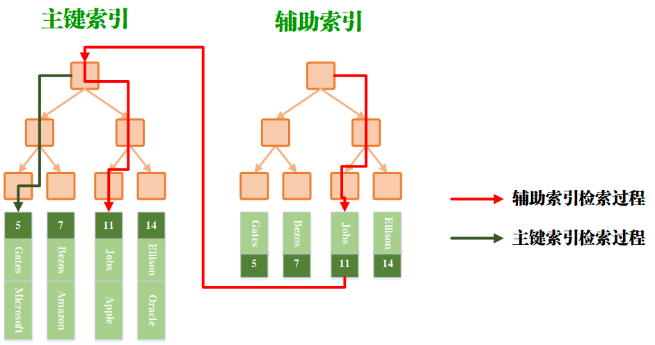 我们又知道,辅助索引存储的键值是非主键的字段。那就也就是说,通过辅助索引,可以找到非主键字段对应的数据行中的主键。