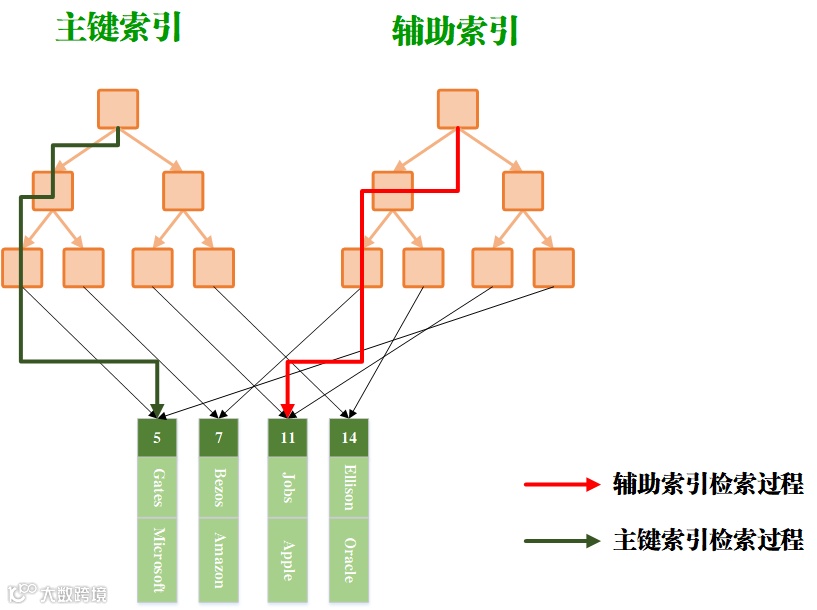 重点来了。当然主键索引和辅助索引一结合,能干啥呢。当直接采用主键进行检索时,可通过主键索引直接获得数据;而当采用非主键进行检索时,先需要通过辅助索引来获得主键,然后再通过这个主键在主键索引中找到对应的数据行。