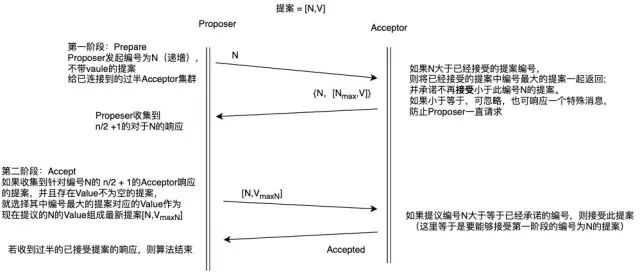 注意:Proposer可以随时丢弃提案,并且提出新的提案;Acceptor也可以随时响应,接受编号更大的提案。