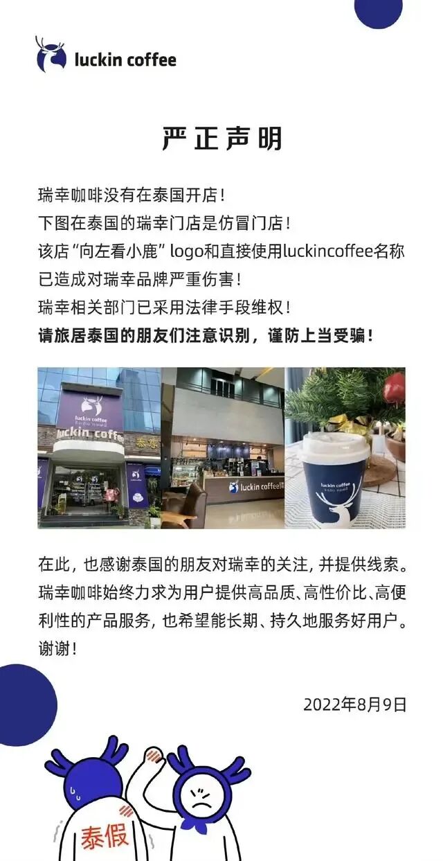 2022年8月,瑞幸咖啡还发布紧急辟谣通知称,其没有在泰国开店。并表示:“上述泰国门店的‘向左看小鹿’logo和直接使用luckin coffee名称已造成对瑞幸品牌严重伤害,公司相关部门已采用法律手段维权,请旅居泰国的朋友们注意识别,谨防上当受骗。”