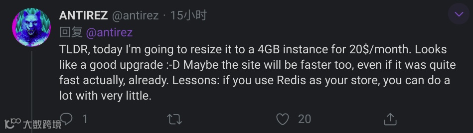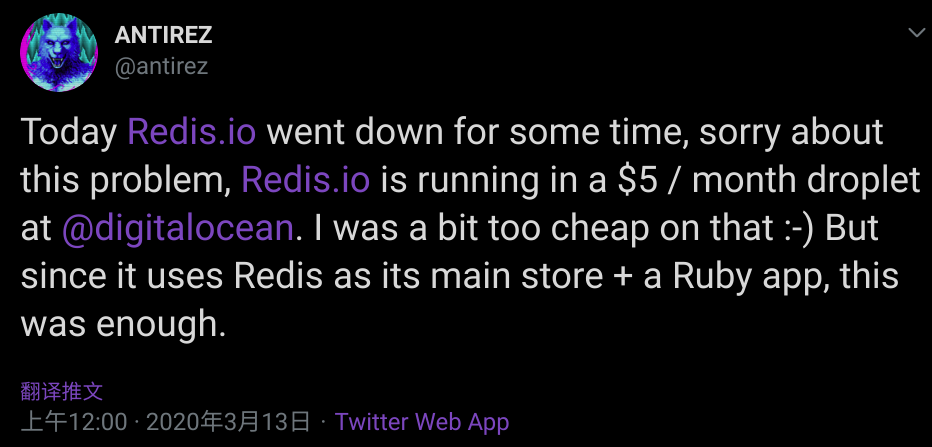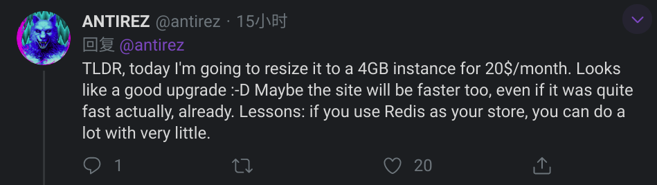Antirez 解释道,选择这么便宜的配置是因为这台主机使用了 Redis 作为持久存储,并且只跑了一个 Ruby 应用,所以已经足够应对。