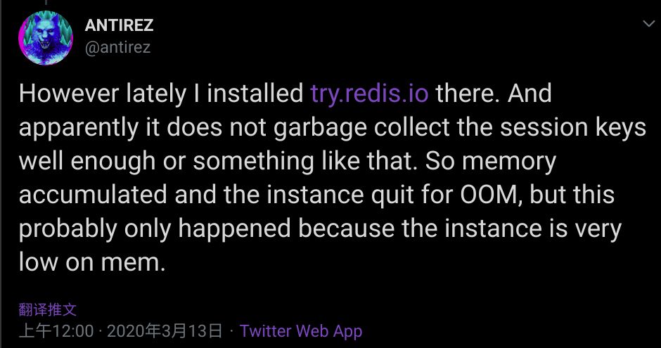 Redis 作者 Antirez 很快修复了问题,并解释了宕机的原因。原来是因为他最近在运行 redis.io 的实例上安装了 Try Redis(用于在线体验 Redis 数据库),可能是未能对 session key 进行良好的垃圾回收,从而导致内存累积,最终因为内存溢出(OOM )引发宕机。
